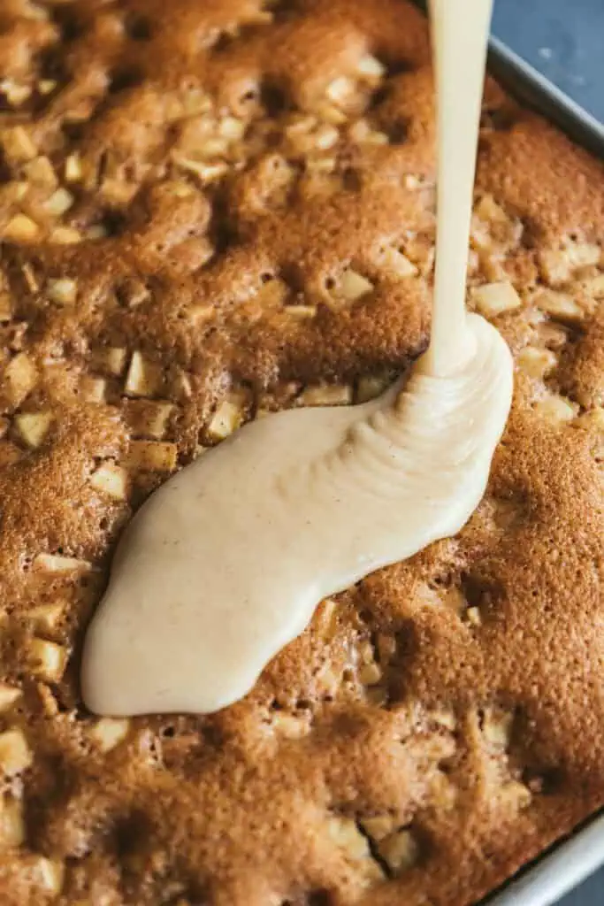 Make the Warm Glaze. While the cake bakes, melt the butter and apple cider together in a medium saucepan over medium heat. Whisk in the powdered sugar, sour cream, and cinnamon until smooth and pourable.