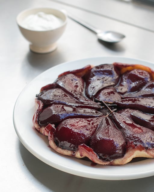 I’m always amazed when I turn out this tart. The glistening, ruby-colored pears are so pretty I almost hate to cut it. But moments later, I’m glad that I did. Along with a spoonful of nutty crème fraîche, this riff of the classic tarte Tatin will get no arguments from traditionalists. And if it does, find less judgmental dining companions.
