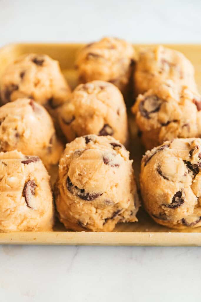 - Step 5: Portion and Freeze. Scoop the dough into tall 5-ounce cookie balls – shape them taller than they are wide. They’ll look comically tall for a cookie, but trust the process. Place the dough balls side-by-side on a small sheet pan, cover with plastic wrap, and freeze overnight.