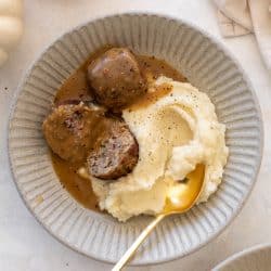 These turkey and stuffing meatballs are a fun twist on traditional turkey and stuffing! Juicy, tender meatballs are made with stuffing mix, packed with flavor and served over mashed potatoes with gravy. A perfect Friendsgiving meal!