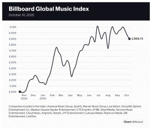 Only three stocks — Spotify, JYP Entertainment and HYBE — in the 19-company Billboard Global Music Index (BGMI) finished the week ended Oct. 10 with gains. Dragged down by numerous losses near or greater than 10%, the BGMI fell 1.9% to 2,899.73, its third consecutive weekly decline.